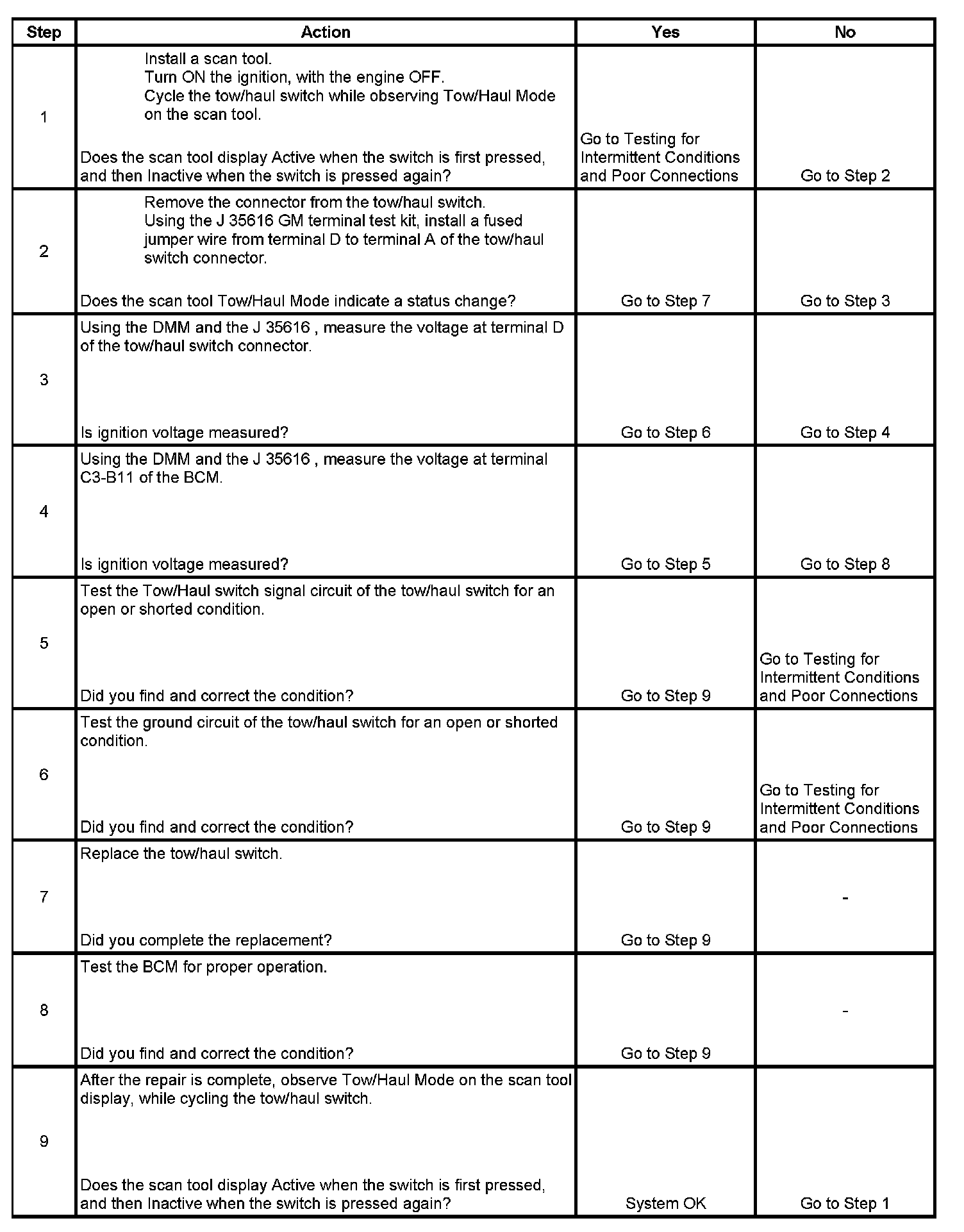 If the electrical circuit checks are OK and the tow/haul shift pattern is not occurring, there may be a mechanical/hydraulic condition that prevents tow/haul operation. Refer to Symptoms - Automatic Transmission . - Symptoms - Automatic Transmission