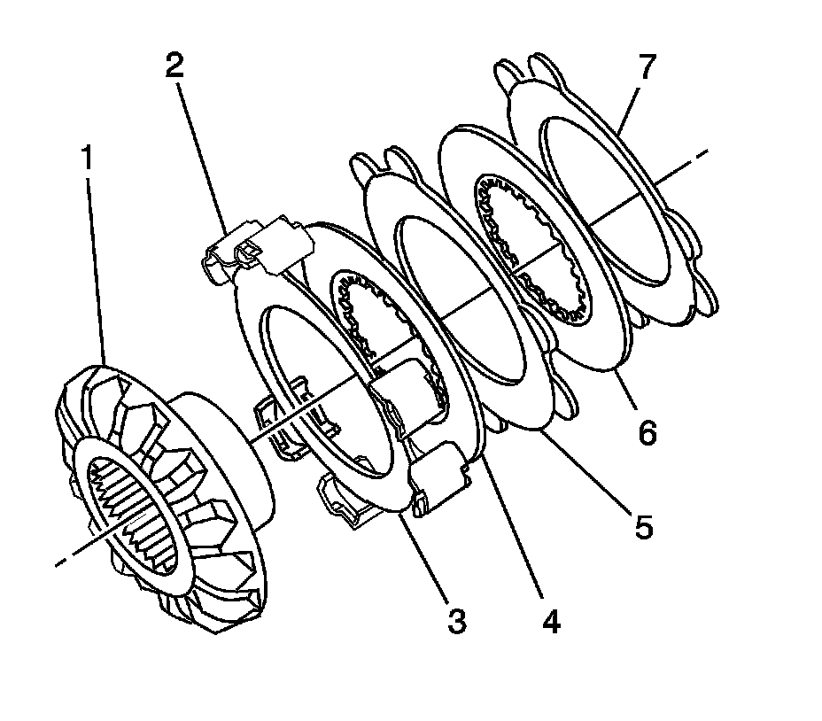 2. Remove the clutch discs and the splined discs (3-7) from the locking differential side gear (1).