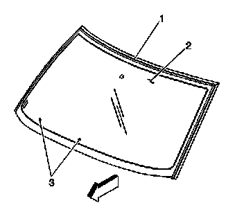 Install the wiper arm onto the drive shaft while aligning the center of the wiper blade to the black locator dots (3) on the lower center windshield (2).