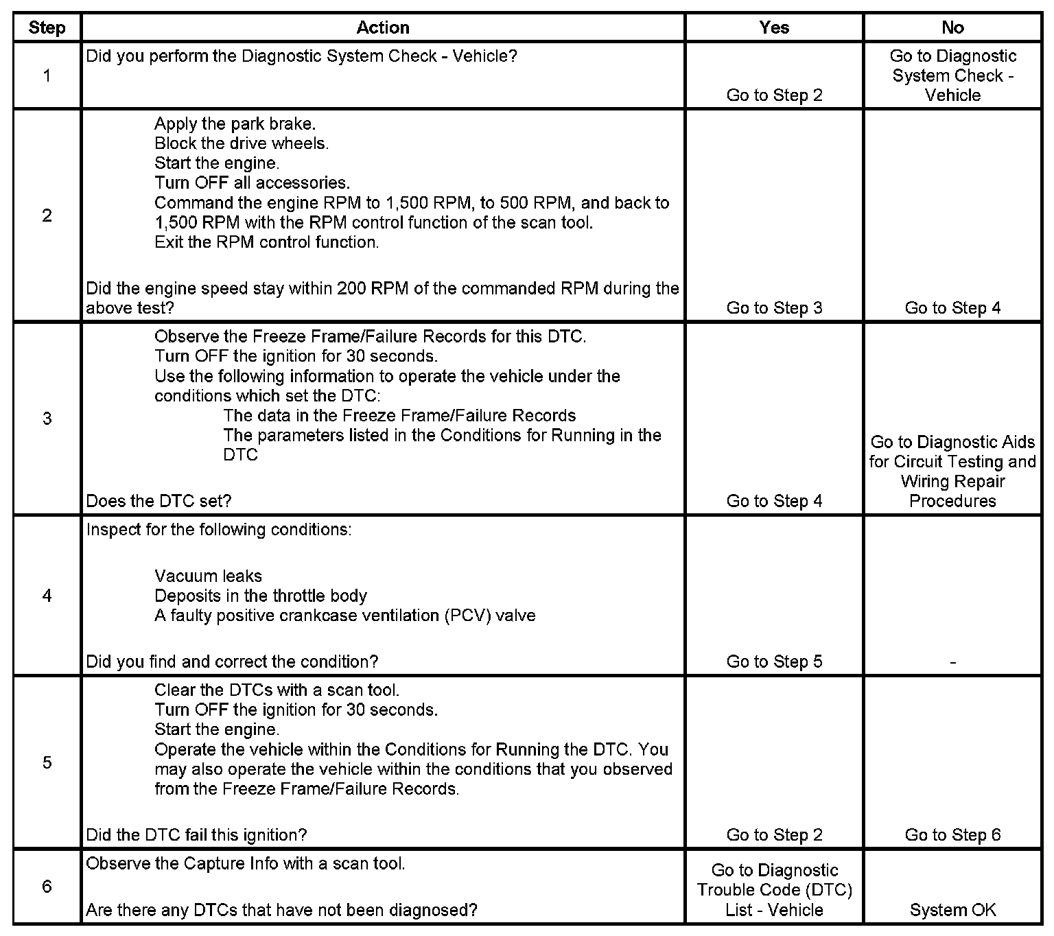 The electronic throttle control (ETC) system uses various inputs from the powertrain control module (PCM). This system uses these inputs to control the idle speed through serial data circuits to the throttle actuator control (TAC) module. The DC motor, which is located on the throttle body, activates the throttle plate. In order to decrease idle speed, the TAC module commands the throttle closed, reducing air flow into the engine, and the idle speed decreases. In order to increase the idle speed, the TAC module commands the throttle plate open, allowing more air in order to bypass the throttle plate. If the actual idle RPM does not match the desired idle RPM within a calibrated time, DTC P0507 sets.