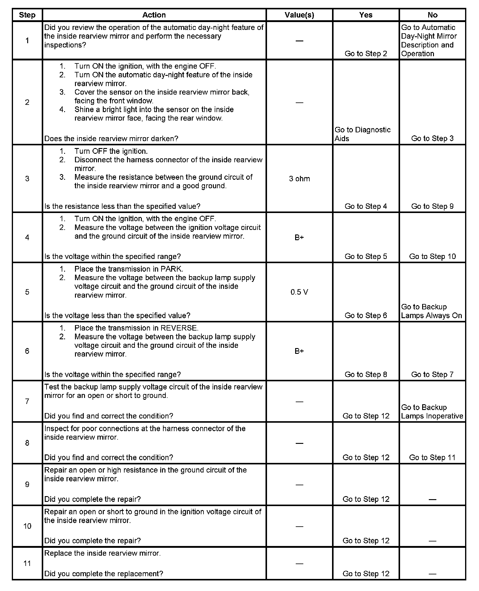 The automatic day-night feature of the inside rearview mirror may not operate properly or become inoperative due to an intermittent short to battery voltage in the backup lighting system. Refer to Testing for Intermittent Conditions and Poor Connections. Component Tests and General Diagnostics