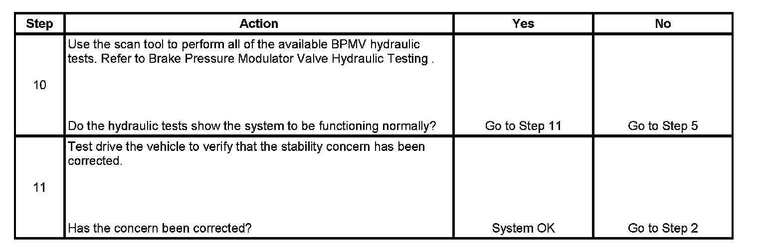 Proper operation of the vehicle stability enhancement system (VSES) is highly dependent on the ability to apply brake pressure to a selected wheel, through the brake pressure modulator valve (BPMV), as commanded by the electronic brake control module (EBCM). The EBCM may not be able to detect certain mechanical failures that may cause the VSES to perform poorly. This diagnostic procedure is designed to help diagnose concerns of poor vehicle stability, that may occur without the presence of any DTCs, by verifying the following: