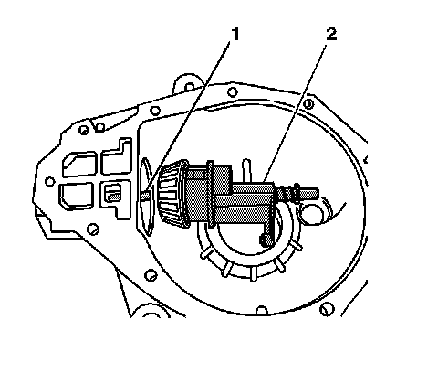 2. Install the J 33838-2 (1) and the bolt (2) to the outer pinion bearing.