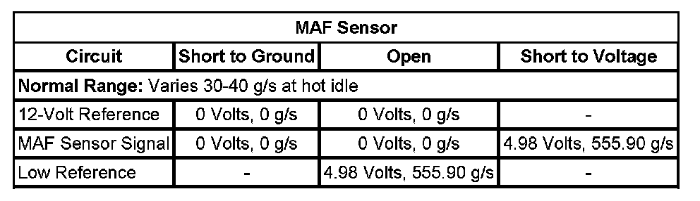 The MAF sensor produces an output voltage based on the inlet air flow through the air induction system. This output voltage will display on the scan tool as a voltage parameter and as a grams per second (g/s) parameter. If the ECM detects that the actual MAF sensor voltage signal is greater than or less than the possible range of a normally operating sensor it will set a DTC.