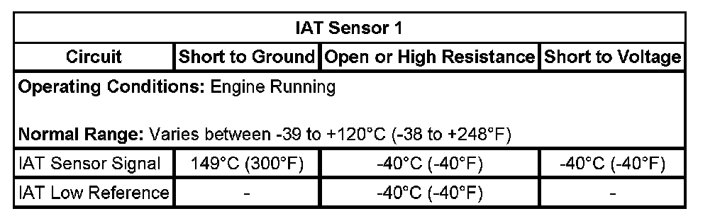 The IAT Sensor 1 parameter is greater than 148°C (299°F) for more than 1 second. This is equal to or less than 0.10 volt on the IAT signal circuit as measured by the ECM.