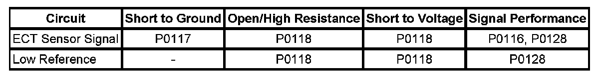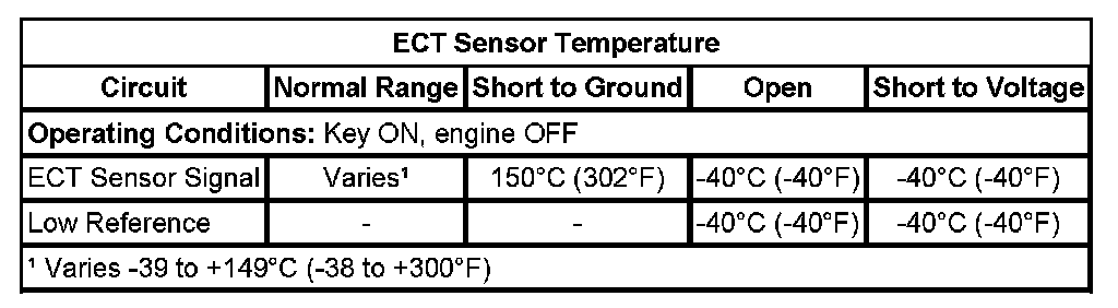 Measure and record the resistance of the ECT sensor at various ambient temperatures and compare those measurements to the Temperature vs. Resistance table.