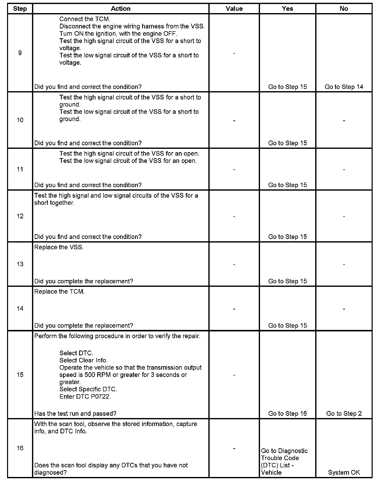 If the TCM detects no vehicle speed when there is engine speed in a drive gear range, then DTC P0722 sets. DTC P0722 is a type B DTC.