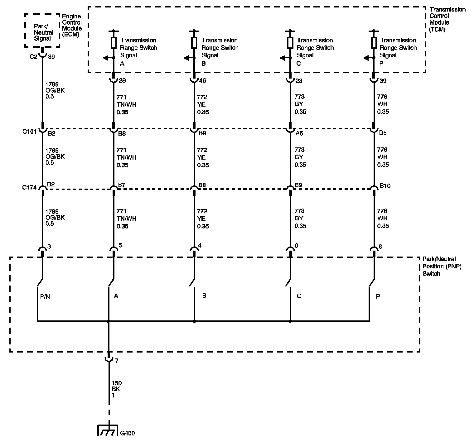 The park/neutral position (PNP) switch is externally mounted on the transmission manual shaft. As the gear range selector lever is moved, the state of the P/N switch may change, causing the park/neutral signal circuit to open or close. An open circuit or switch indicates a DRIVE range and a high voltage signal at the engine control module (ECM). A closed circuit or switch indicates PARK or NEUTRAL and a low voltage, 0 volts, signal at the ECM.