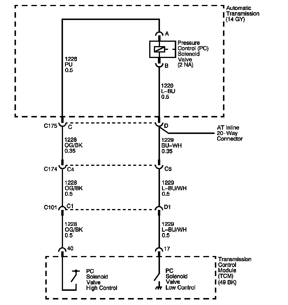 The pressure control (PC) solenoid valve is an electronic device that regulates transmission line pressure based on the current flow through its coil winding. The magnetic field produced by the coil moves the internal valve of the solenoid, which varies pressure to the pressure regulator valve. The transmission control module (TCM) controls the PC solenoid valve by applying a varying amount of amperage to the solenoid. The applied amperage can vary from 0.1-1.1 amps. Low amperage, 0.1 amp, indicates high line pressure. High amperage, 1.1 amps, indicates low line pressure. The duty cycle of the PC solenoid valve is expressed as a percentage of energized ON time. 0 percent indicates 0 ON time, non-energized, or no current flow. Approximately 60 percent at idle indicates maximum ON time, energized, or high current flow. The TCM determines the appropriate line pressure for a given load by comparing the throttle position sensor voltage, the engine speed and other inputs.