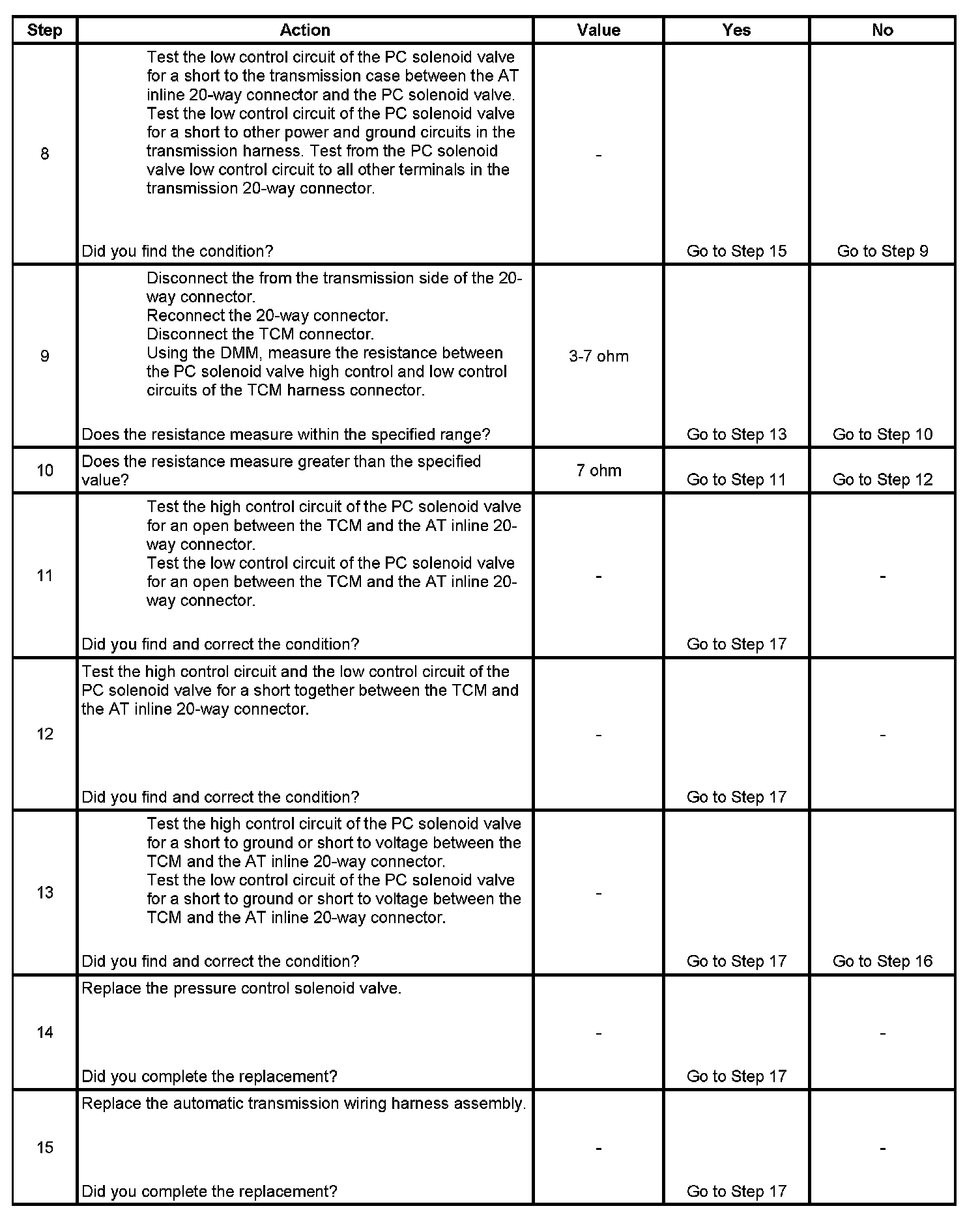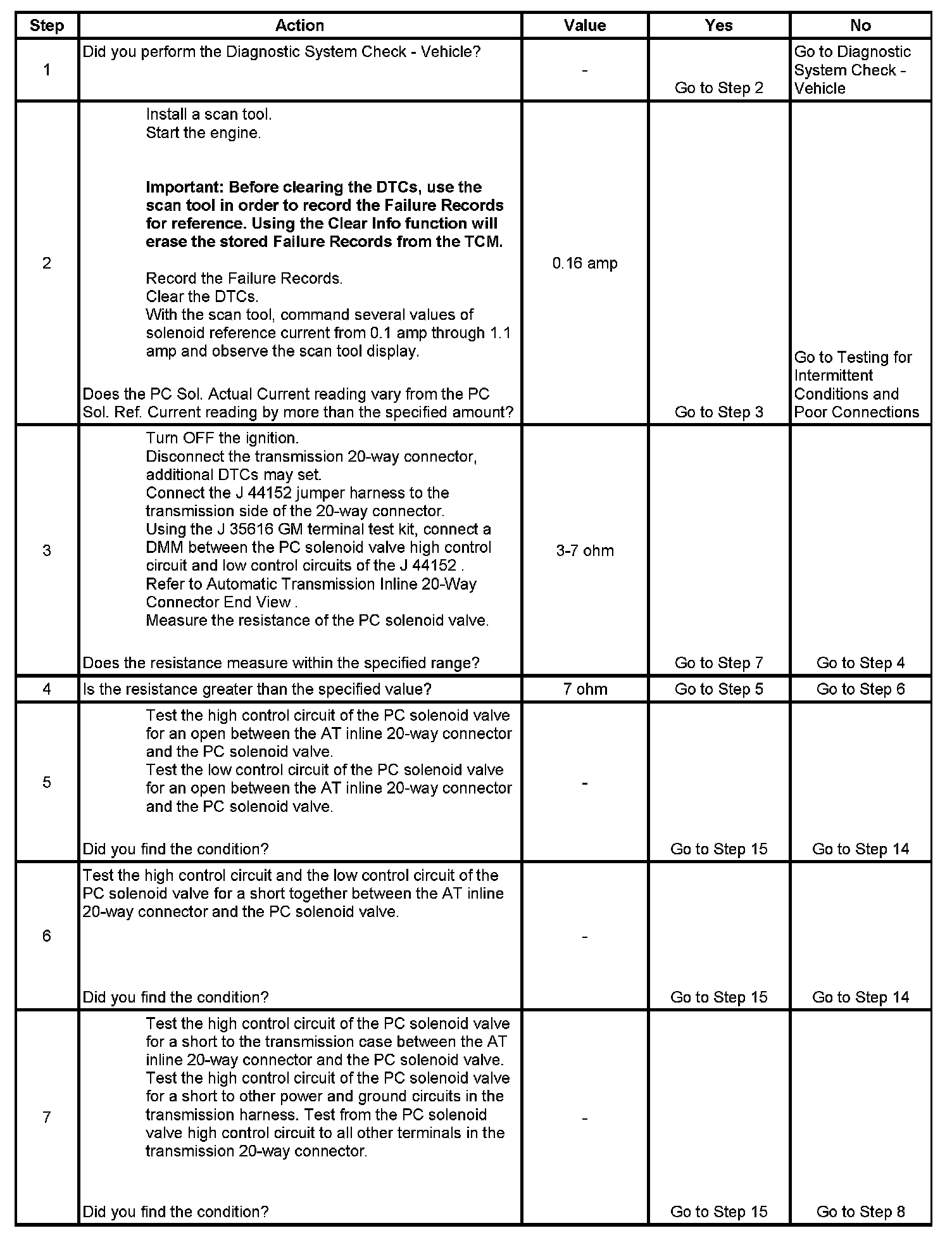 3. This step tests the transmission wiring harness and the PC solenoid valve for correct resistance.
