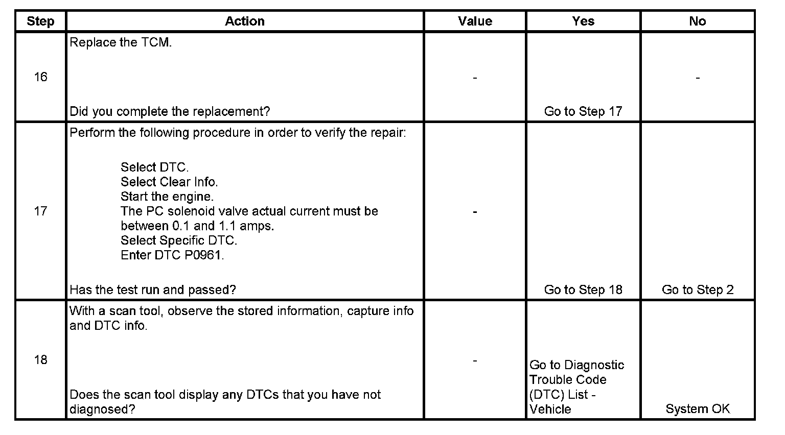 When the TCM detects a continuous open or short to ground in the PC solenoid valve circuit, then DTC P0961 sets. DTC P0961 is a type C DTC.