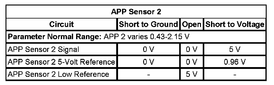- Accelerator Pedal Position (APP) Sensor 2 Circuit Low Voltage