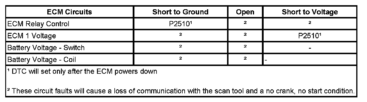 If the ECM relay fails to close, the engine will not crank. Communication will not be available with the use of a scan tool.