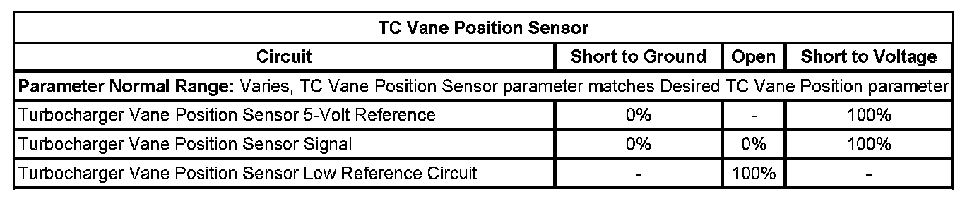 • If all circuits, the TC vane position sensor, and the TC vane position solenoid test normal, replace the turbocharger.