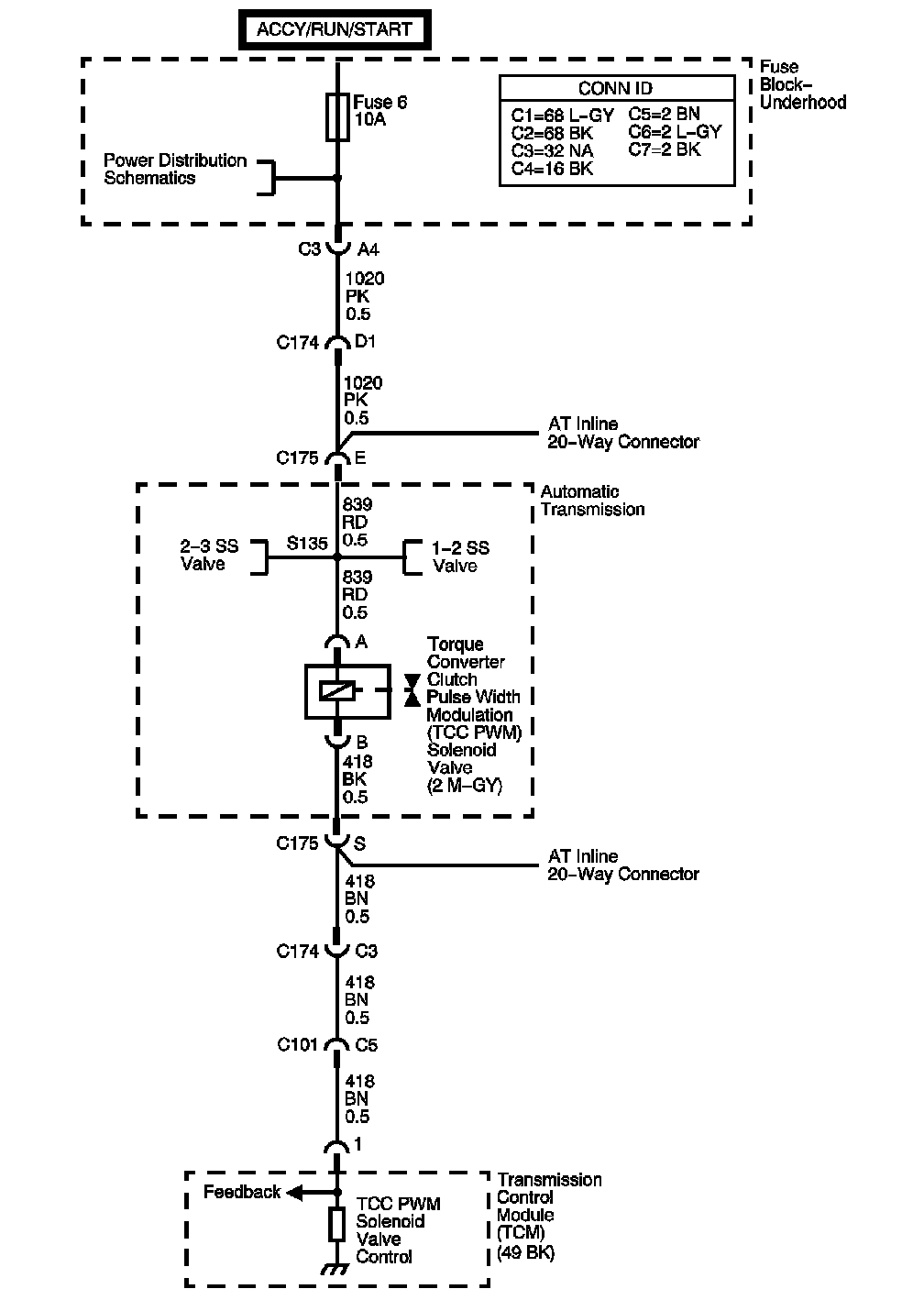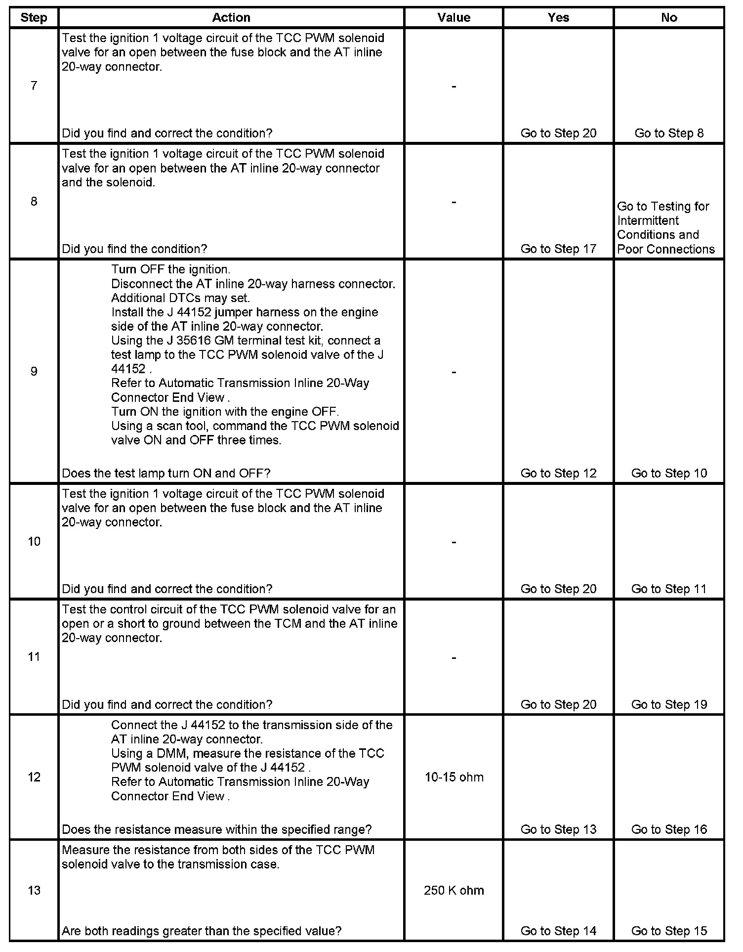 The torque converter clutch pulse width modulation (TCC PWM) solenoid valve controls the fluid acting on the converter clutch valve. The converter clutch valve controls the TCC application and release. The solenoid attaches to the control valve body within the transmission. The solenoid receives voltage through the ignition voltage circuit. The transmission control module (TCM) controls the solenoid by providing a ground path on the TCC PWM solenoid valve control circuit. Current flows through the solenoid coil according to the duty cycle, percentage of ON and OFF time. The TCC PWM solenoid valve provides a smooth engagement of the TCC by operating during a duty cycle percent of ON time.