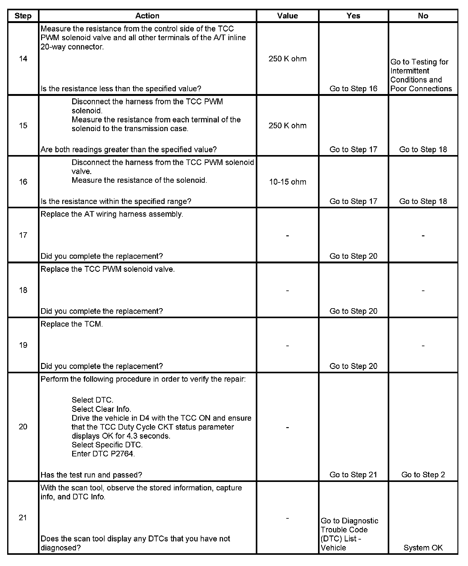 When the TCM detects a continuous open or short to ground in the TCC PWM solenoid valve control circuit, then DTC P2764 sets. DTC P2764 is a type B DTC.