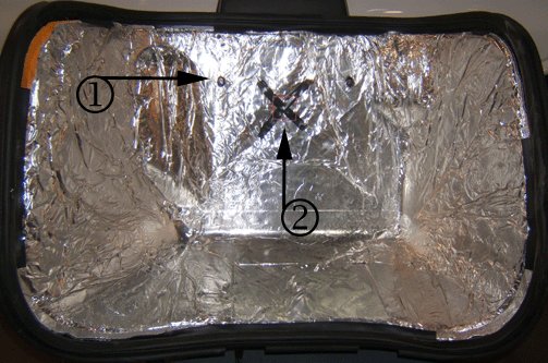 4. Place the engine cover on a workbench. Notice the two raised areas on the inside of the engine cover (1). Tape an x using the two raised areas as a straight edge (2).