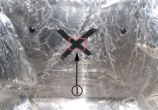 5. Cut a 50 mm (2 in) square section (1) out of the engine cover insulation, centered at the point of contact (or the taped x) with the vane position sensor.