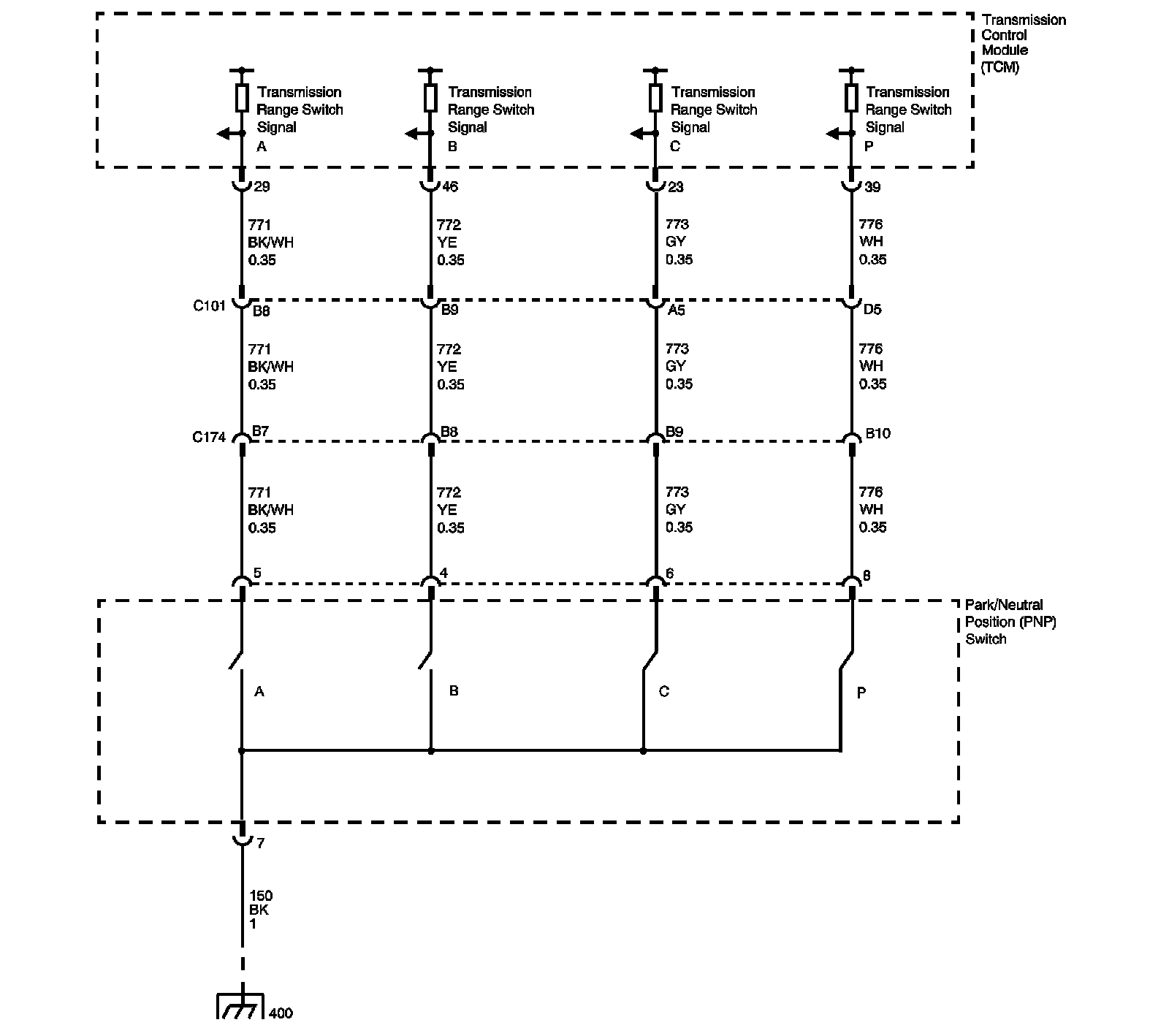 Refer to Transmission Range Switch Logic for valid combinations of switch signal circuits A, B, C and Parity. On the table, HI indicates an ignition voltage signal. LOW indicates a 0 voltage signal.