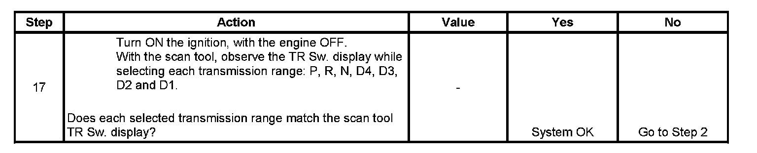 4. By disconnecting the TR switch, the ground path of all TR switch circuits is removed and the TCM should recognize all circuits as open. The scan tool should display HI for all range signal states.