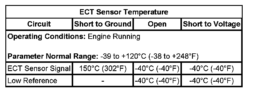 The ECT sensor temperature is less than -39°C (-38°F) for more than 10 seconds. This is equal to more than 4.8 volts on the ECT signal circuit, as measured by the ECM.