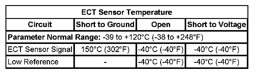 Measure and record the resistance of the ECT sensor at various ambient temperatures and compare those measurements to the Temperature vs. Resistance table.