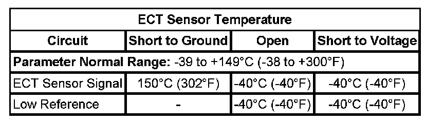 * Measure and record the resistance of the ECT sensor at various ambient temperatures and compare those measurements to the Temperature vs. Resistance table.