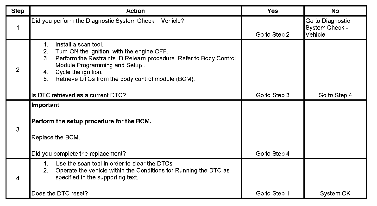 The body control module (BCM) stores the last 4 digits of the sensing and diagnostic module (SDM) part number, information also called restraints ID. After the BCM is reprogrammed, the restraints ID is set to zero. A restraints ID relearn needs to be performed for the BCM. For more information on this procedure, refer to Body Control Module Programming and Setup. Programming and Relearning