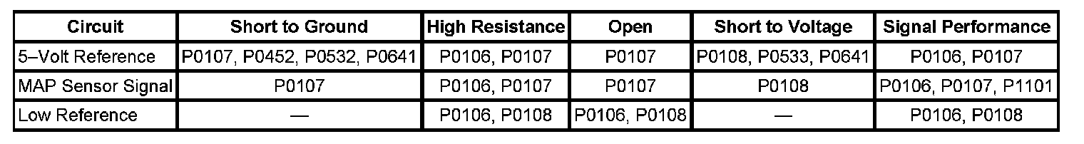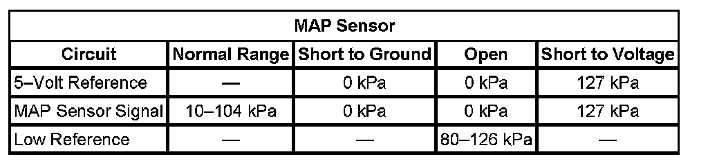 * The engine control module (ECM) detects that the difference between measured MAP and the MAP Performance Test 1 is greater than 20 kPa for greater than 0.5 second.