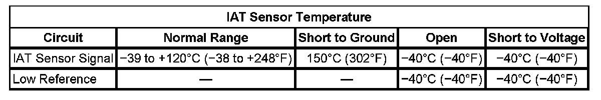 * Engine running, observe the scan tool IAT Sensor parameter. The reading should be between -39 to +120°C (-38 to +248°F) depending on the current ambient temperature and the vehicle operating conditions.