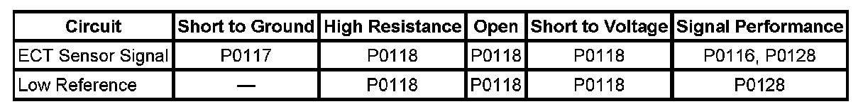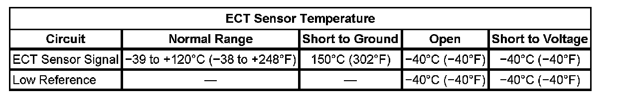 * This diagnostic runs in a specific range. Measure and record the resistance of the ECT sensor at various ambient temperatures greater than -7°C (+19°F), then compare those measurements to the Temperature vs Resistance table. Refer to Temperature Versus Resistance.