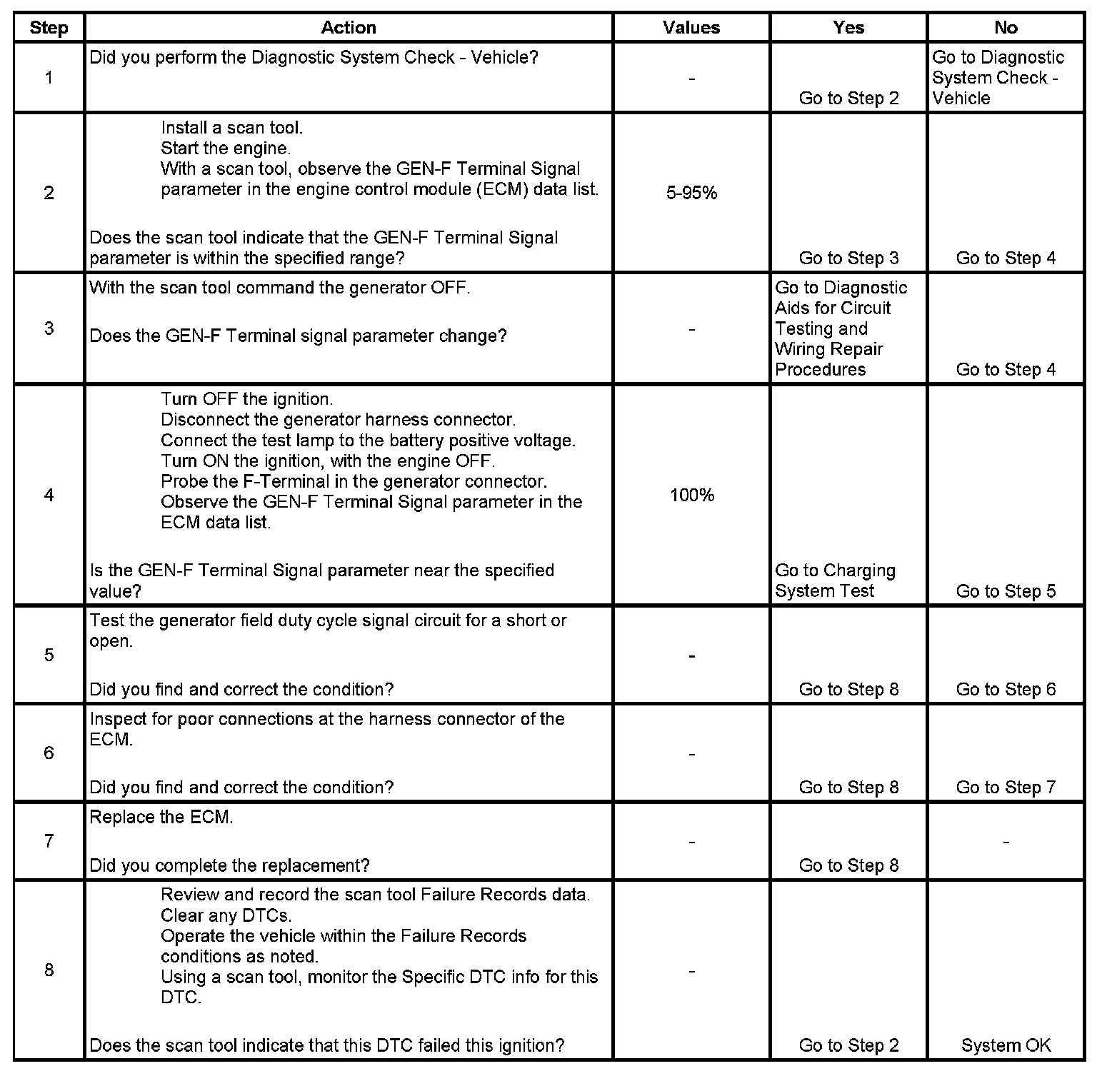 The ECM monitors the state of the generator field duty cycle signal circuit. When the key is in the RUN position and the engine is OFF, the ECM should detect a duty cycle near 0 percent. However, when the engine is running, the duty cycle should be between 5-100 percent. The ECM monitors the PWM signal. If the ECM detects an out of range PWM signal, DTC P0622 will set. When the DTC sets, the ECM will send a serial data message to the instrument panel cluster (IPC) to illuminate the charge indicator.