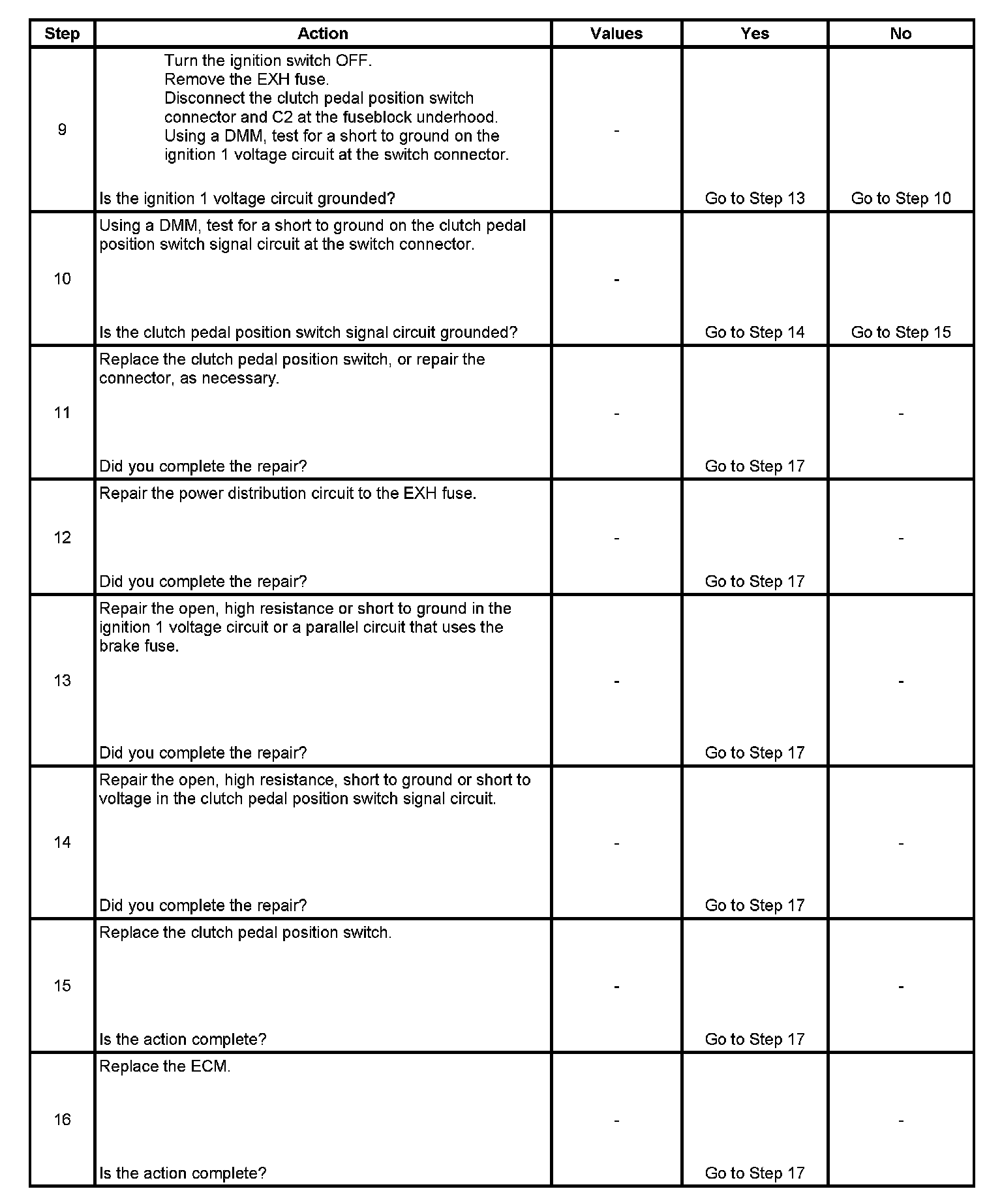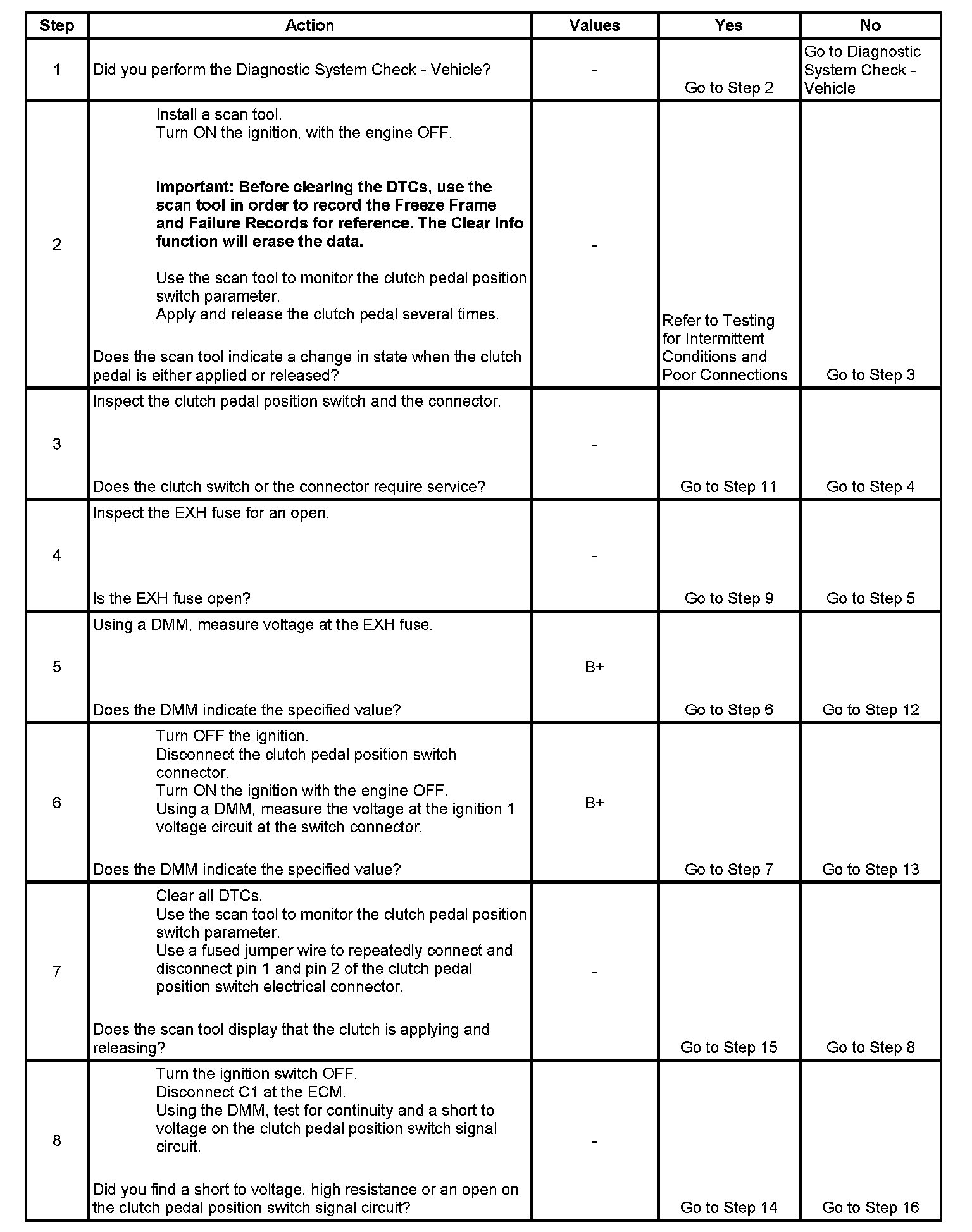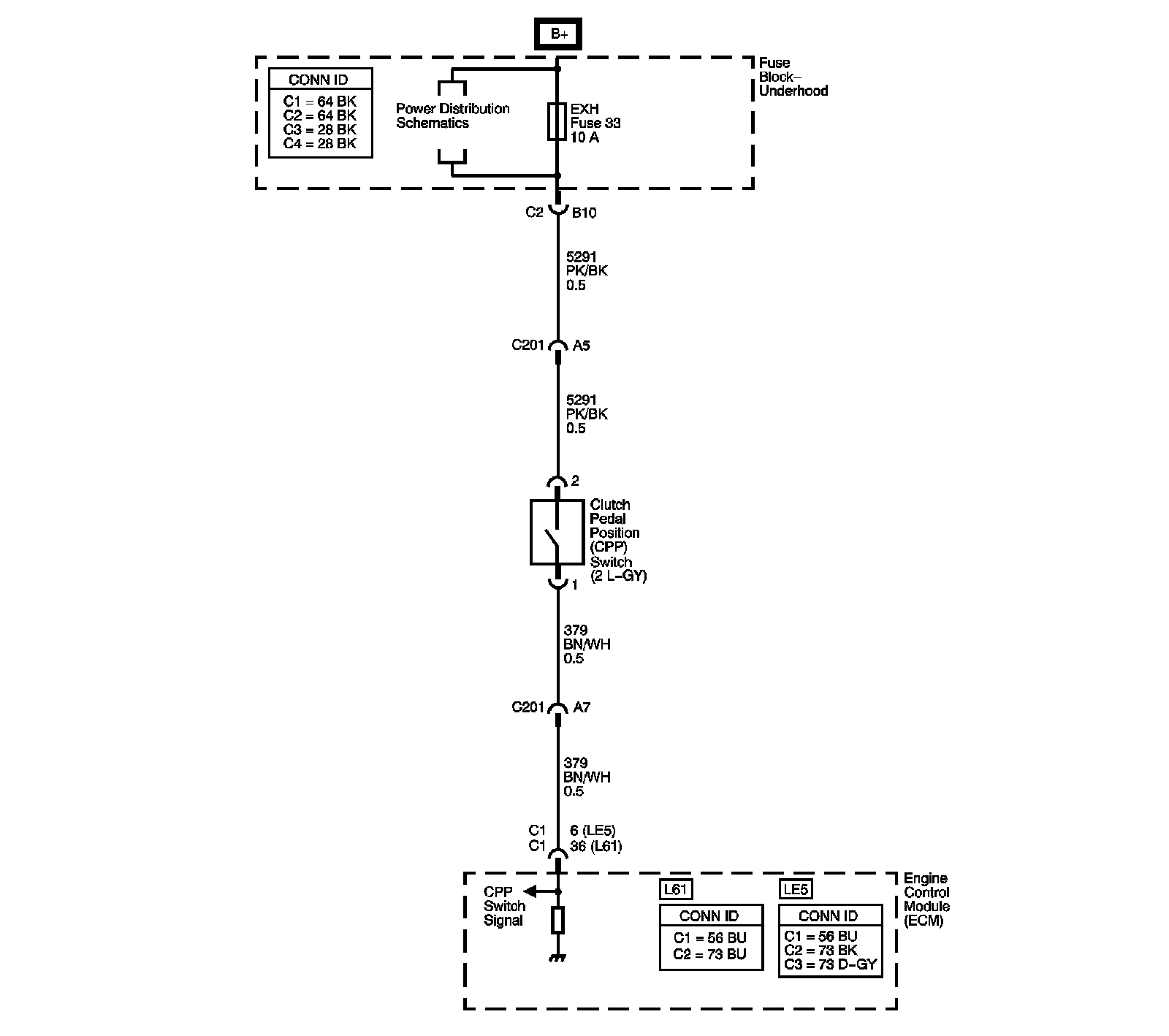 The clutch switch is a normally closed switch, clutch pedal released. The engine control module (ECM) detects an ignition voltage on the clutch switch circuit when the clutch switch is closed. The ECM detects 0 volts on the clutch switch circuit when the clutch switch is open, clutch pedal depressed.