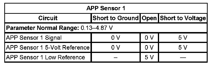 The APP sensor 1 voltage is less than 0.13 volt, or more than 4.87 volts for more than 0.4 second.