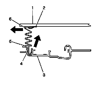 5. Using a flat-bladed tool, press the locking tab (4) outward, from inside the roof opening, in order to detach the side opening closeout panel cover from the sunroof track channel (3).