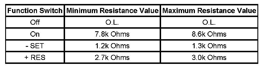 3. Measure the resistance between terminals 4 and 6 at the cruise control switch side of the connector. Individually activate and hold each cruise control function switch and compare the resistance reading to the values for the On, Off, - SET and the + RES switches.