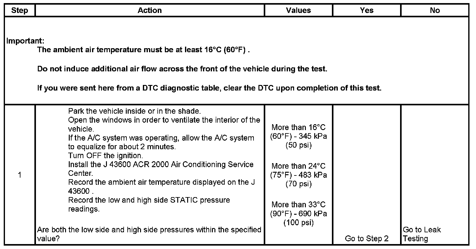 1. This step determines if the A/C system has at least the minimum refrigerant charge required to operate the system without damage.