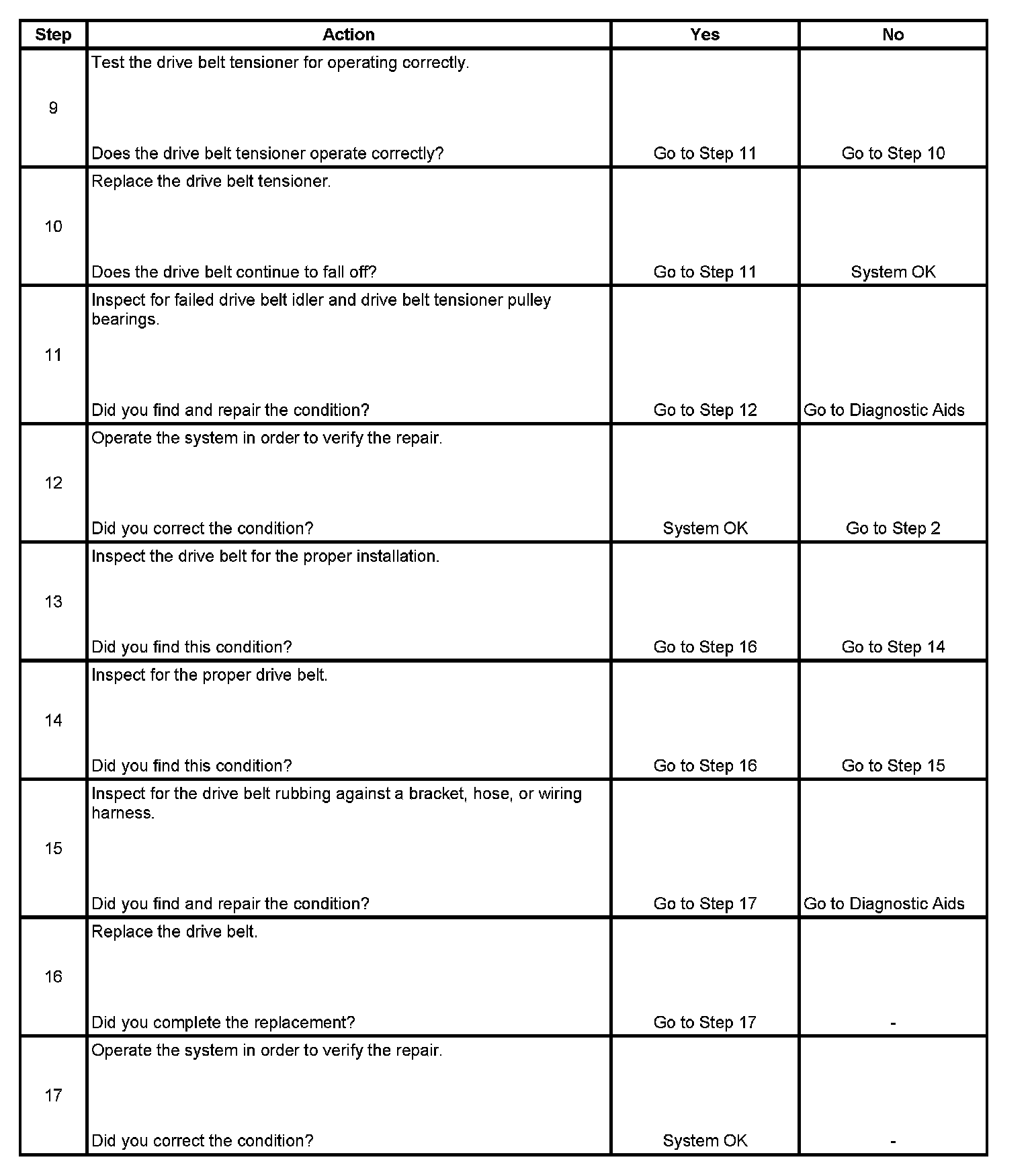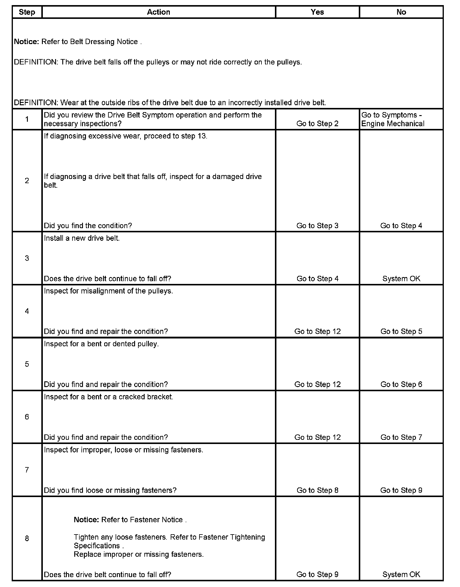 An extra load that is quickly applied on released by an accessory drive component may cause the drive belt to fall off the pulleys. Verify the accessory drive components operate properly.
