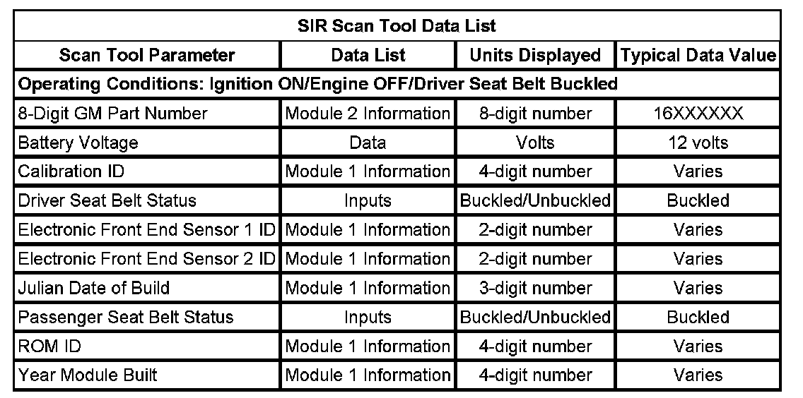 The SIR scan tool data list contains all the restraint system related parameters that are available on the scan tool. The parameters in the list are arranged in alphabetical order. The column, Data List, indicates the location of the parameter within the scan tool menu selections.