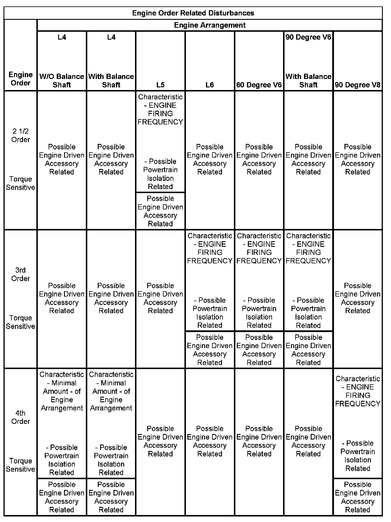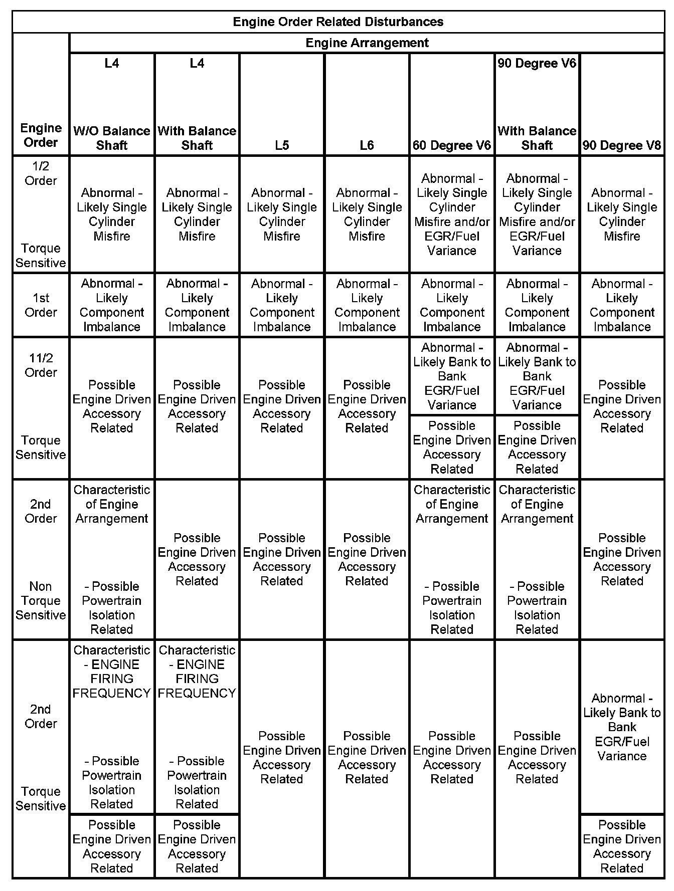 3. If the dominant frequency in Hz, recorded during duplication of the disturbance and the engine firing frequency in Hz, just calculated ARE related, then an engine FIRING FREQUENCY related disturbance is present. Engine firing frequency disturbances are usually related to improper isolation of a component. Refer to the Engine Order Related Disturbances table.