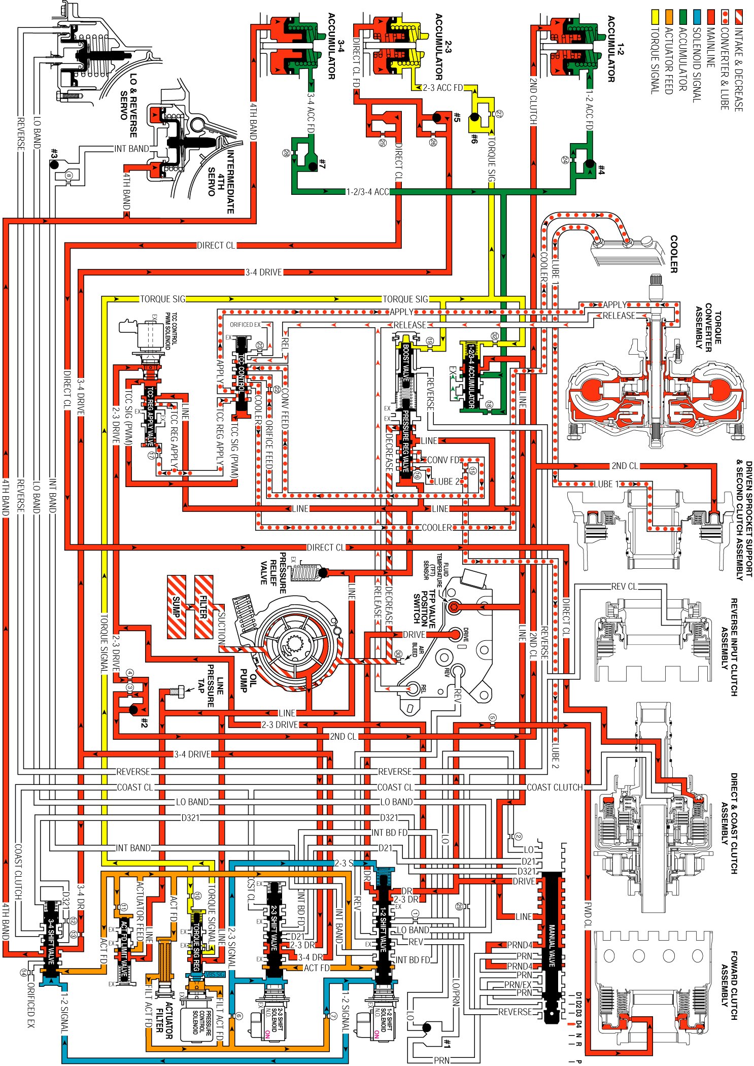 The 3-4 accumulator feed fluid which is forced from the 3-4 accumulator unseats the #7 checkball and the fluid is routed back to the 3-4 accumulator valve. This pressure forces the 1-2/3-4 accumulator valve against a combination of spring force and torque signal fluid pressure in order to regulate the exhaust of excess accumulator fluid. This regulation provides additional control for the intermediate and fourth band apply.