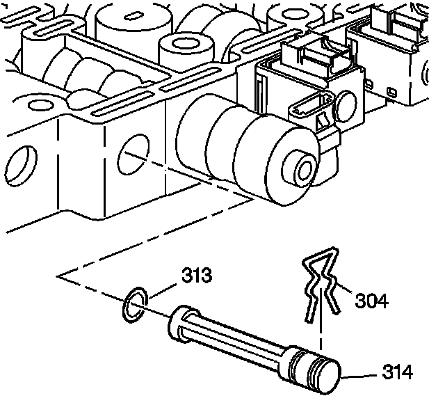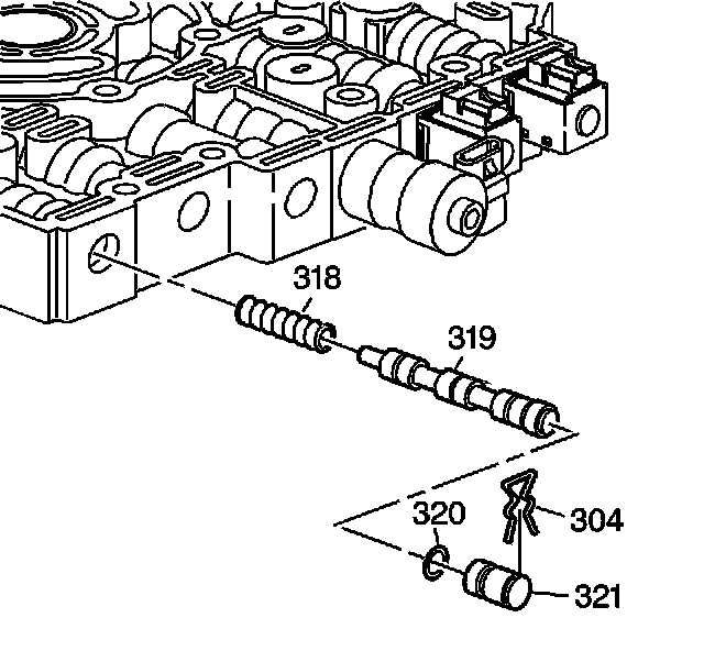 1. Remove the 3-4 shift valve retainer clip (304), the bore plug (321), with O-ring (320), the 3-4 shift valve (319) and the 3-4 shift valve spring (318).