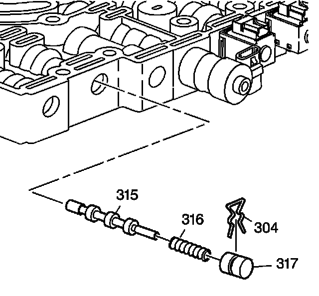 8. Remove the TCC control valve retainer clip (304), the bore plug (317), the spring (333), and the TCC control valve (334).