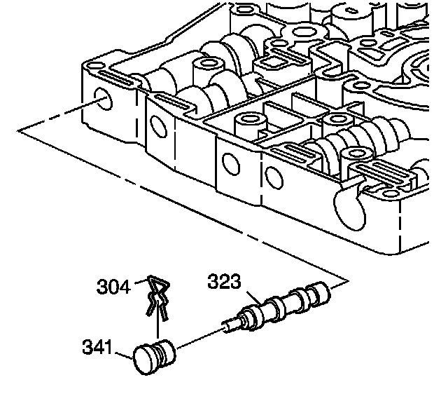10. Remove the 1-2/3-4 accumulator valve retainer clip (304), the plug (341), and the accumulator valve (323).