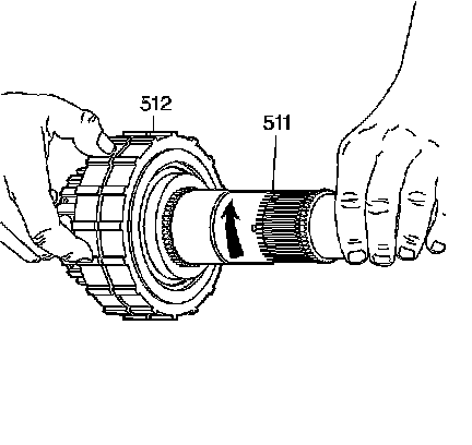23. Assemble the input sun gear shaft and sprag clutch assembly (511 and 512) into the input housing. The splines on the input sun gear shaft engage with the coast clutch fiber plates.