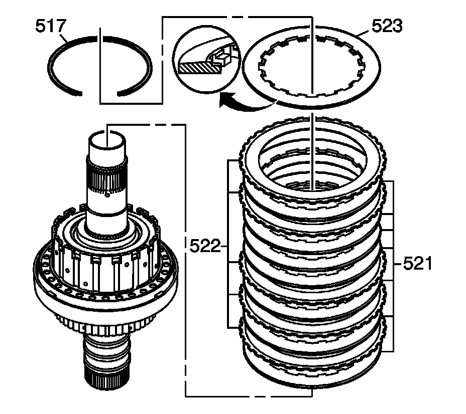 24. Assemble the 6 steel (521) and 6 new fiber (522) direct clutch plates into the input housing in alternating order beginning with a steel plate (521).