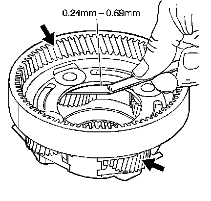 1. Measure the pinion gear end play for proper clearance. Use a feeler gage. The clearance should be 0.24-0.69 mm (0.01-0.027 in).