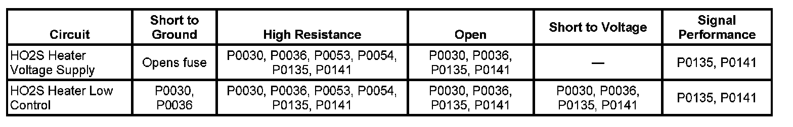 Heated oxygen sensors (HO2S) are used for fuel control and post catalyst monitoring. Each HO2S compares the oxygen content of the surrounding air with the oxygen content in the exhaust stream. The HO2S must reach operating temperature to provide an accurate voltage signal. A heating element inside the HO2S minimizes the time required for the sensor to reach operating temperature. Voltage is provided to the heater by an ignition voltage circuit through a fuse. With the engine running, ground is provided to the heater by the HO2S heater low control circuit, through a low side driver within the engine control module (ECM). The ECM uses pulse width modulation (PWM) to control the HO2S heater operation to maintain a specific HO2S operating temperature range.