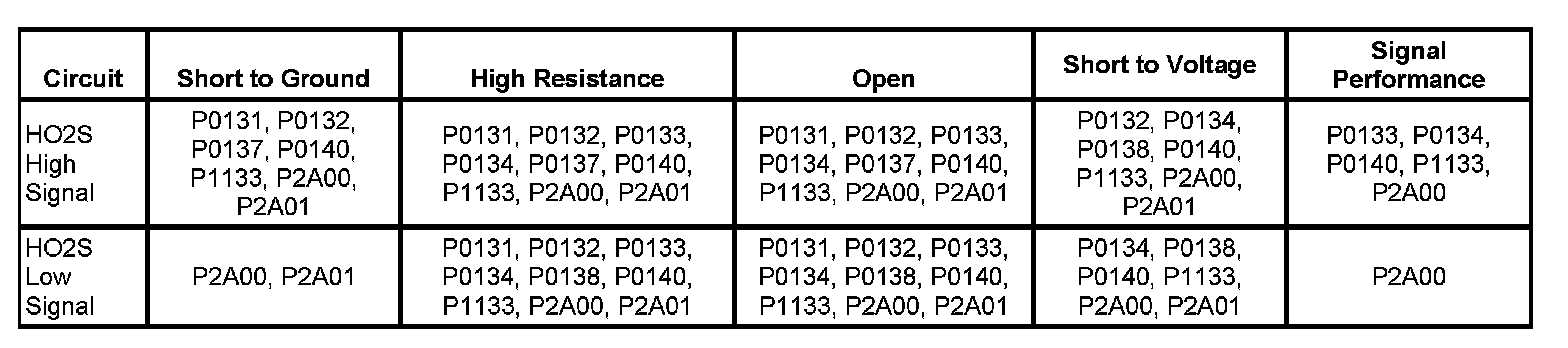 DTC P0133, P0134, P0140, P1133, P2A00 or P2A01
