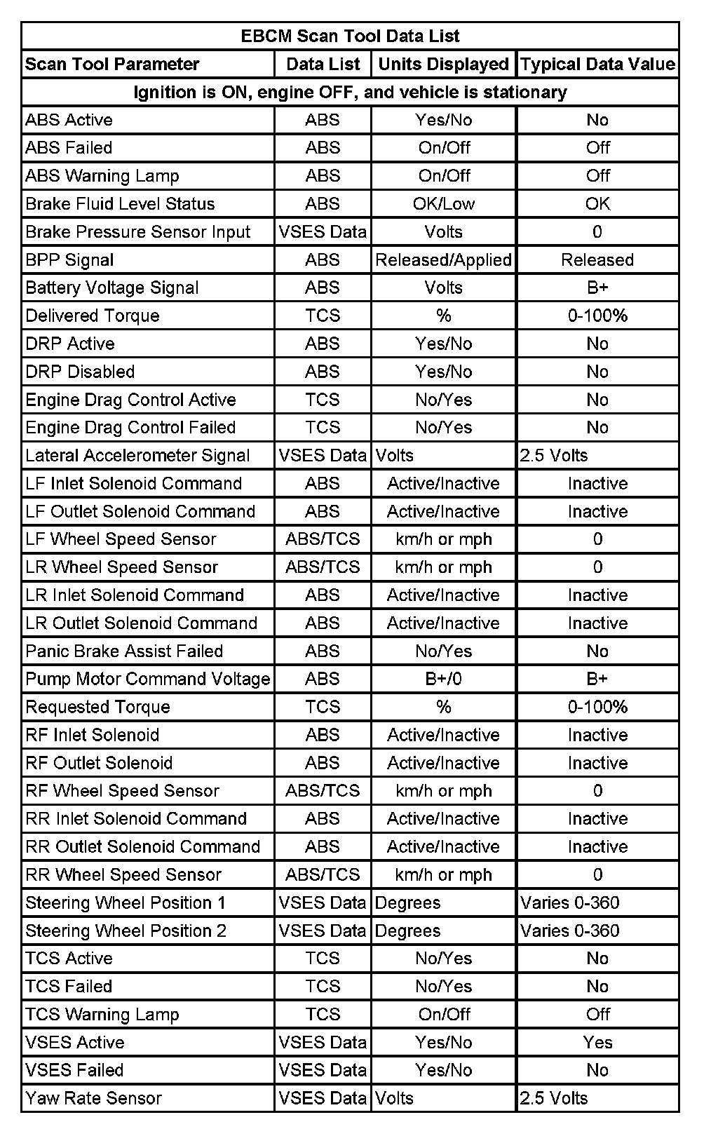 Use the EBCM Scan Tool Data Lists as directed by a diagnostic table or in order to supplement the diagnostic procedures. Begin all the diagnostic procedures with the antilock brake system (ABS) Diagnostic Starting Point. Use the EBCM Scan Tool Data Lists only after the following is determined: